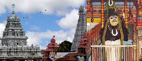 * அங்கோலா பண்டேஸ்ரி கோயிலின் நுழைவு வாயிலில் அனுமன் சிலை காட்சி தருகிறது.