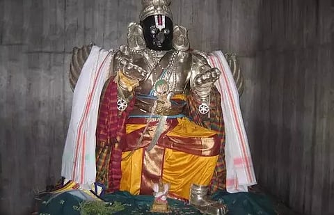 இந்தக் கோயிலில் கருடாழ்வாருக்கு தனி சன்னிதி அமைந்துள்ளது. இவர் உலகப் பிரசித்தி பெற்ற கல் கருடாழ்வார் ஆவார். இக்கோயிலில் ஒரே கல்லால் ஆன கருட பகவானுக்கு நாள்தோறும் ஆறு கால பூஜை நடைபெறுகிறது. பங்குனி மற்றும் மார்கழி மாதம் என்று வருடத்துக்கு இருமுறை கருட சேவை நடைபெறும். உத்ஸவத்தின் முதல் நாள் மாலை கருட பகவான் வெளியே வருவார். சன்னிதியிலிருந்து வெளியே வரும்போது வெறும் 4 பேர் மட்டுமே அவரை சுமப்பார்கள். தொடர்ந்து அவருடைய எடை படிப்படியாக அதிகரித்து 8, 16, 32, 64, 128 பேர் என அவரை சுமப்பவர்களின் எண்ணிக்கையும் அதிகரிக்கும். இந்த கருட சேவை நடைபெறும் சமயத்தில் கல் கருட பகவானின் மேனியில் வியர்வைத் துளிகள் உருவாவதையும் பக்தர்கள் தரிசித்து இருக்கிறார்கள். அதேபோல இந்த ஊர்வலம் முடிந்து மறுநாள் அதிகாலை கோயிலுக்குத் திரும்பும்போது எடை படிப்படியாய் குறைய, 128, 64, 32, 16, 8 என்று கடைசியில் முதலில் சுமந்த 4 பேர்கள் மட்டும் சுமந்து சன்னிதிக்குக் கொண்டு செல்வார்கள். இன்று வரை இந்த அதிசய நிகழ்வுக்குக் காரணம் கண்டுபிடிக்க முடியவில்லை.