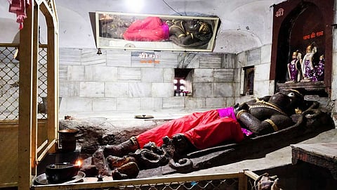ஒரே கல்லில் உருவாக்கப்பட்ட இந்த ஆஞ்சநேயர் 9.3 அடி நீளம் கொண்டவர். வலது காலை நீட்டிய நிலையில் சயனித்திற்கும் அனுமனின் இடது கால் சற்றே மடங்கிய நிலையில் இருக்கிறது. அவரது இடது பாதத்தின் கீழ் சனி பகவானின் சிற்பம் செதுக்கப்பட்டிருக்கிறது. சனி பகவானால் பிடிக்க முடியாத தெய்வங்களாக விநாயகரையும் ஆஞ்சநேயரையும் புராணங்கள் போற்றுகின்றன. ஒரு முறை ஆஞ்சநேயரை பிடித்து வந்த சனி பகவானை அவர் தன்னுடைய காலடியில் வைத்து அழுத்தினார் என்றும், இதை அடுத்து சனி பகவான் ஆஞ்சநேயரை பிடிப்பது இல்லை என்றும் ராம நாமம் உச்சரிப்பவர்களுக்கு கடுமையான துன்பங்கள் அளிப்பதில்லை என்றும் உத்தரவாதம் தந்ததாக புராணம் சொல்லுகிறது. அந்த அடிப்படையில்தான் தன்னுடைய காலடியில் சனி பகவானை அழுத்திய நிலையில் இந்த தல ஆஞ்சநேயர் அருள்பாலிக்கிறார். இவரை வழிபாடு செய்தால் ஏழரைச்சனி, அஷ்டமச்சனி, அர்த்தாமச்சனி போன்றவற்றின் பாதிப்பு குறையும் என்கிறார்கள். இத்தலத்தில் உள்ள ஆஞ்சநேயர் சிலை கடந்த பல வருடங்களாக முழுவதும் செந்தூரத்தால் பூசப்பட்டு ஆஞ்சநேயரின் உருவமே தெரியாதபடி இருந்தது. ஆனால், அந்த செந்தூரம் சில ஆண்டுகளுக்கு முன்பாக அகற்றப்பட்டு ஆஞ்சநேயரின் முழுமையான உருவத்தை தரிசிக்கும் பாக்கியம் பக்தர்களுக்கு இப்போது கிடைத்துள்ளது.