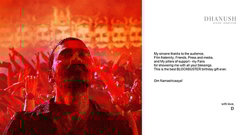 மாபெரும் எதிர்பார்ப்பில் வெளிவந்து இப்படம் உலகளவில் அமோக வரவேற்பை பெற்று வெற்றியடைந்துள்ளது. இந்த நிலையில், நடிகரும், இயக்குனருமான தனுஷ் தனது சமூக வலைத்தளத்தில் ராயன் படத்தின் வெற்றி குறித்து பதிவு ஒன்றை வெளியிட்டுள்ளார். அதில் மக்கள், நண்பர்கள், பிரஸ் - மீடியா மற்றும் என்னுடைய துணையாக இருக்கும் தூண்கள் எனது ரசிகர்கள் அனைவருக்கும் என்னுடைய நன்றிகள். இது என்னுடைய சிறந்த ப்ளாக் பஸ்டர் பிறந்தநாள் பரிசு. ஓம் நமசிவாய என கூறி தனது நன்றிகளை தெரிவித்துள்ளார்.