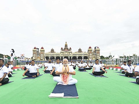 இன்று சர்வதேச யோகா தினத்தை முன்னிட்டு கர்நாடகாவில் மைசூர் அரண்மனை மைதானத்தில் நடைபெற்ற பிரம்மாண்ட யோகாசன விழாவில் பிரதமர் நரேந்திர மோடி பங்கேற்றார்.