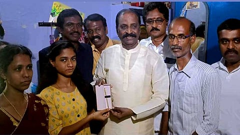 ட்விட்டர் பதிவில், "திண்டுக்கல் வருவேன். எனக்குக் கிடைத்த "தங்கப் பேனா"வினை தச்சுத் தொழிலாளி மகள் நந்தினிக்கு பரிசாகத் தருவேன் நான்." என்று பதிவிட்டிருந்தார். அதன்படி இன்று 11.05.2023 வியாழக்கிழமை காலையில், திண்டுக்கல் மாணவி நந்தினி வீட்டுக்கு நேரில் சென்று, சாதனை மாணவி நந்தினிக்கு "தங்கப் பேனா" பரிசளித்தார் கவிப்பேரரசு வைரமுத்து.