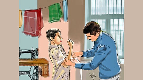 மஞ்சள் பையில் இருந்து நீல நிற டிராயர் துணியையும், வெள்ளை சட்டை துணியையும் எடுத்து அப்பா நீட்ட, ஏதோ துணி வெட்டிக் கொண்டு இருந்த டைலர் "வாங்கண்ணே! தம்பிக்கு யூனிஃபார்மா? வேலையில் நீங்க வந்ததை கவனிக்கல…"என்ற ஃபிட் மேன் டைலர் அழகாக இருந்தார்.