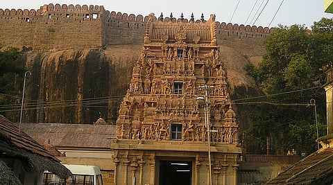 இக்கோட்டையில் மிகவும் பழைமையான இரண்டு கோயில்கள் உள்ளன. அவை சத்தியமூர்த்தி பெருமாள் கோயில், சத்தியகிரீஸ்வரர் சிவன் கோயில்களாகும். இரண்டுமே குடைவரை கோயில்களாகும். கோட்டைக்கு அடிவாரத்திலே அமைந்திருக்கும் சத்தியமூர்த்தி பெருமாள் கோயில், ஸ்ரீரங்கத்திற்கு அடுத்தபடியாக முக்கியத்துவம் வாய்ந்த கோயிலாகக் கருதப்படுகிறது.