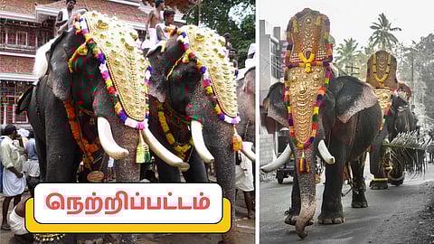 நெற்றிப்பட்டம் தயாரிப்பு: மூன்றரைக் கிலோ செம்பு, 3 சவரன் (24 கிராம்) தங்கம் ஆகியவை கலந்து ஒரு சாதாரணமான நெற்றிப்பட்டம் செய்யப்படுகிறது. ஒரு ஆபரணம் செய்யக் குறைந்தது 20 நாட்கள் ஆகும். நெற்றிப்பட்டத்தின் அளவு யானைக்கு யானை வேறுபடும். 9 லிருந்து 10 அடி உயரம் உள்ள யானைக்கு 60 அங்குலம் நீளம் உள்ள நெற்றிப்பட்டம், அதில் குறைந்தது 11 சந்திரக்கலா (பிறைநிலா) இருக்க வேண்டும் என்கின்றனர். மேலும் இதில், கூம்பன் கிண்ணம் என்று அழைக்கப்படும் ஒரு கூர்மையான பொருள், 2 சுற்று ஒன்று, 37 அரை பந்துகள், 40 முழு பந்துகள், 1 கலாஞ்சி மற்றும் 5000 சிறிய குமிழ்கள் இதில் இடம் பெற்றிருக்கின்றன.