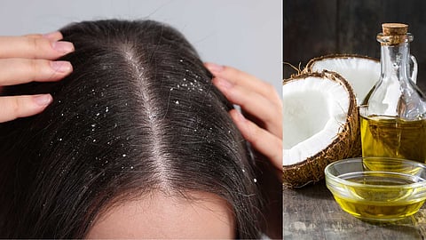 இரண்டு ஸ்பூன் தேங்காய் எண்ணெயை லேசாக சூடாக்க வேண்டும். அதில் இரண்டு ஸ்பூன் எலுமிச்சைச் சாறு கலக்க வேண்டும். இந்தக் கலவையை உச்சந்தலையில் தடவி நன்றாக பத்து நிமிடங்களுக்கு மசாஜ் செய்ய வேண்டும். 30 நிமிடங்கள் கழித்து ஷாம்பு போட்டு தலையை அலச வேண்டும். தேங்காய் எண்ணெய் உச்சந்தலையை ஈரப்பதம் ஆக்கி பூஞ்சையை நீக்க வழி செய்கிறது. எலுமிச்சைச்சாறு பொடுகை எதிர்த்துப் போராடுகிறது.