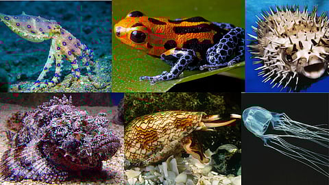 3. பஃப்பர் ஃபிஷ் (Puffer fish): இதனுடைய கல்லீரல், கருப்பை, தோல் மற்றும் சதை ஆகியவற்றில் நச்சுத்தன்மை உள்ளது. இது கடித்தால் நரம்பு, சுவாச செயலிழப்பு பக்கவாதம் மற்றும் மரணம் ஏற்படும். இது கடித்ததும் உடனடியாக மருத்துவ உதவி செய்யாவிட்டால் சில மணி நேரங்களில் மரணம் ஏற்படும்.