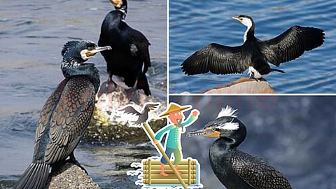 சீன மீனவர்கள் பொதுவாக பெரிய நீர்க்காகத்தை (Phalacrocorax Carbo) பயன்படுத்துகின்றனர். அதே நேரத்தில் ஜப்பானில், ஜப்பானிய நீர்க்காகம் (Phalacrocorax Capillatus), பெரு நாட்டில் நியோட்ரோபிக் நீர்க்காகம் (Nannopterum Brasilianum) பயன்படுத்தப்படுகிறது. நீர்க்காகங்களின் உறவினர்களான டார்ட்டர்கள் (Anhinga) இனத்தைச் சேர்ந்த பறவைகளும் சில சமயங்களில் இந்த மீன்பிடி நுட்பத்திற்குப் பயன்படுத்தப்படுகின்றன.