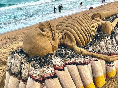 பத்மபூஷன் விருது பெற்ற பிரபல மணல் சிற்பக் கலைஞர் சுதர்சன் பட்நாயக், உலக புகையிலை தினத்தை முன்னிட்டு இன்று பூரி கடற்கரையில் மணல் சிற்பம் ஒன்றை உருவாக்கியுள்ளார்.