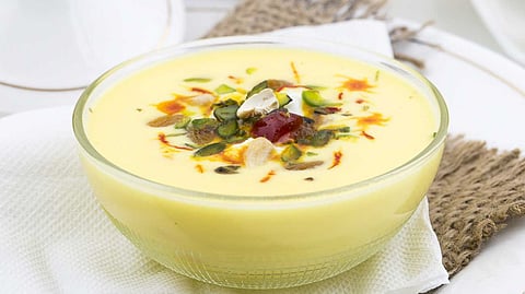 முதலில் அடுப்பில் ஃபேனை வைத்து ஒரு தேக்கரண்டி நெய் விட்டு பொடியாக நறுக்கி வைத்திருக்கும் முந்திரி, பாதாம், பிஸ்தாவை பொன்னிறமாக வறுத்தெடுத்துக் கொள்ளவும். இப்போது ஃபேனில் மிச்சமிருக்கும் நெய்யில் பால் 1 லிட்டரை ஊற்றிக்கொள்ளவும் அத்துடன் நிறத்துக்காக குங்குமப்பூ சிறிதளவு, ஏலக்காய் ¼ தேக்கரண்டி சேர்த்து நன்றாக கொதிக்க விடவும்.