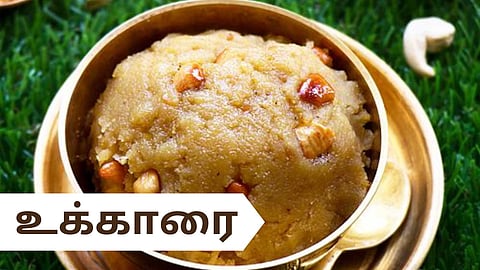 ஓரளவுக்கு திரண்டு வந்தவுடன் வறுத்து வைத்துள்ள முந்திரியை சேர்த்து மீதமுள்ள நெய்யையும் கொஞ்சம் தாராளமாக சேர்த்து கடாயில் ஒட்டாமல் வரும் வரை கிளறி இறக்கினால் உக்காரை ரெடி.