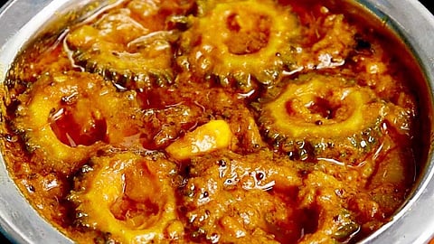 பச்சைக் காய்கறி வகைகள் அனைத்துமே உடலுக்கு நலன் என்பது தெரிந்தாலும் கசப்பு சுவை உள்ள பாகற்காயை கண்டாலே சிலருக்கு ஆகாது. ஆனால் இந்த பாகற்காய் குடலில் உள்ள பூச்சிகளை ஒழிக்கவும், நீரிழிவு நோய் பாதிப்பைக் குறைக்கவும் சிறந்த நிவாரணியாக உள்ளது என்பது தெரிந்தால் நிச்சயம் இந்த காயை ஒதுக்க மாட்டோம். பாகற்காய் கசப்பு சுவையானதால்தான் நாம் விரும்புவதில்லை. ஆனால் அதையே இது போன்ற புளிக் குழம்பாக வைத்து தரும்போது நிச்சயம் அனைவரும் விரும்பி சாப்பிடுவார்கள். வாருங்கள் பாகற்காய் புளிக்குழம்பு எப்படி செய்வது என்று பார்ப்போம்.