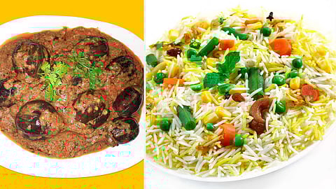 குக்கரில் தாராளமாக எண்ணெய் விட்டு சோம்பு, பட்டை சேர்த்து தாளிக்கவும். பிறகு வெங்காயம், தக்காளி, இஞ்சி பூண்டு பேஸ்ட் சேர்த்து வதக்கவும். பின்னர் காய்கறிகளை சேர்த்து வதக்கி அரிசியுடன் சாம்பார்பொடி சேர்த்து கிளறி தேவையான அளவு உப்பு சேர்த்து, தண்ணீர்விட்டு தனியா, புதினா, கறிவேப்பிலை சேர்த்து கிளறி வேகவிடவும். 7 நிமிடத்தில் 3 விசில் வரவும் குக்கரை நிறுத்தி நெய், எலுமிச்சைசாறு சேர்த்துக்கிளறி ,கத்திரிக்காய் கிரேவியை சேர்த்து பரிமாறி சாப்பிடவும். வெளியில் பயணம் செய்யும்பொழுது இதை எடுத்துச் சென்று சாப்பிட வசதியாக இருக்கும்.