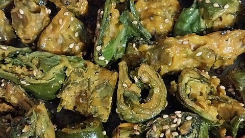4 அல்லது 5 லேயேர்கள் போதுமானது. பெரிய இலைகளின் மீது பேஸ்ட் தடவி சுருட்டிய பின் மீந்திருக்கும் பேஸ்ட்டில் பொடியாக நறுக்கி வைத்த இலைகளை கலந்து கொண்டு, ஒரு தட்டில் எண்ணெய் தடவி அதில் இந்த மாவை ஊற்றவும்.