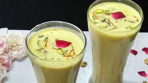 இப்போது ஒரு தம்ளரில் ஒரு தேக்கரண்டி செய்து வைத்திருக்கும் தண்டாய் பவுடரை போட்டு பிரிட்ஜில் வைத்து எடுத்த குளிர்ந்த பாலை அத்துடன் சேர்த்து நன்றாக கலக்கவும். இப்போது மேலே அழகுக்காக உலர்ந்த ரோஜா இதழ், பொடியாக நறுக்கிய பிஸ்தா, ஐஸ்கட்டிகளை சேர்த்து பரிமாறவும். இப்போது சுவையான தண்டாய் தயார். இந்த பானத்தில் முந்திரி, பிஸ்தா,மிளகு, பால் போன்ற பொருட்கள் பயன் படுத்துவதால் உடலுக்கும் மிகவும் ஆரோக்கியமாகும். நீங்களும் வீட்டிலேயே ஒருமுறை தண்டாய் பானத்தை செய்து பார்த்துவிட்டு எப்படியிருந்தது என்று சொல்லுங்கள்.