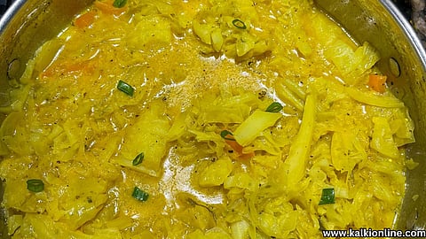 இவை வதங்கியதும் பொடியாக நறுக்கிய முட்டைகோஸ் மற்றும் தண்ணீர் சேர்த்து வேக வைக்க வேண்டும். முட்டைகோஸ் வெந்ததும் அரைத்த தேங்காய் விழுது, மிளகாய், கடலைப்பருப்பு மற்றும் தேவையான அளவு உப்பு, கருவேப்பிலை சேர்த்து கொதிக்க விடவும்.