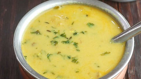 ஊறவைத்த புளியுடன் 1 தக்காளியை நன்றாக கையாலேயே நசுக்கி சேர்த்து விட்டு அத்துடன் தேவையான அளவு உப்பு, ¼ தேக்கரண்டி மஞ்சள் தூள், கொத்தமல்லி சிறிது சேர்த்து கலக்கவும். இத்துடன் தண்ணீர் தேங்காய்ப் பாலை சேர்த்து கலந்து விடவும்.