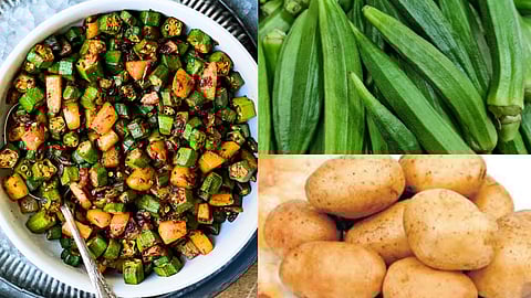 வெண்டைக்காய் மற்றும் உருளைக் கிழங்குகளை நன்கு கழுவி துடைத்து இரண்டு இன்ச் துண்டுகளாக வெட்டவும். ஒரு கடாயில் எண்ணெய் ஊற்றி வெண்டைக்காய்களைப் போட்டு மீடியம் தீயில் பொன் நிறமாகும் வரை பொரித்து எடுக்கவும். அதே கடாயில் மீதமுள்ள எண்ணெய்யை ஊற்றி காய்ந்ததும் கடுகு, நசுக்கிய சீரகம், மல்லி விதை, கறிவேப்பிலை சேர்த்து நன்கு கிண்டவும். பின் அதனுடன் உருளைக்கிழங்கு துண்டுகளை சேர்த்து கொஞ்சம் தண்ணீர் ஊற்றி ஒரு தட்டு போட்டு மூடி சிறு தீயில் வேக விடவும். பின் அத்துடன் பச்சை மிளகாய் இஞ்சி பூண்டு பேஸ்ட் சேர்த்து கலந்துவிடவும்.