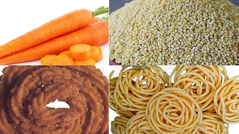 கேரட்டை தோல் சீவி, நறுக்கி மிக்ஸியில் அரைத்து, சாறு பிழியவும். கடலை மாவு, அரிசி மாவு, எலுமிச்சைச்சாறு, கேரட் சாறு, உப்பு, மிளகு சீரகத்தூள் கலந்து மாவை கெட்டியாக பிசையவும். முள்ளு முறுக்கு அச்சில் மாவை நிரப்பி காய்ந்த எண்ணெயில் போட்டு பொரித்து எடுத்தால், பல சுவைகள், அழகான நிறம் கொண்ட கேரட் முறுக்கு தயார்.