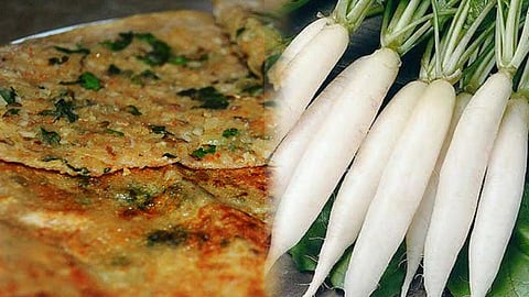 ஒரு பாத்திரத்தில் கோதுமை மாவு, சோள மாவு, உப்பு, துருவிய முள்ளங்கி, பொடியாக நறுக்கிய மிளகாய், வெங்காயம் சேர்த்து கலந்து பிசைந்து சிறிது நீர் தெளித்து கெட்டியாகப் பிசைந்து 1 மணி நேரம் கழித்து மாவை மெல்லிய சப்பாத்திகளாக இட்டு தோசைக் கல்லில் ஒவ்வொன்றாகப் போட்டு எண்ணெய் விட்டு சுட்டு எடுக்கவும். சுவையான சத்தான முள்ளங்கி பராத்தா ரெடி.