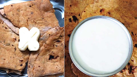 தேவை: சர்க்கரை வள்ளிக்கிழங்கு (வேக வைத்து மசித்தது) - 1 கப். பன்னீர் துருவல் – 1 டேபிள் ஸ்பூன், சீரகப் பொடி, கரம் மசாலா, சாட் மசாலா, ஆம்சூர் (மாங்காய் பொடி ) பெருங்காயப் பொடி – தலா 1 டீ ஸ்பூன், மிளகாய் பொடி - 1 ½ டீ ஸ்பூன் ,ஓமம் – 1 ஸ்பூன் , கோதுமை மாவு – 1 கப், நெய்- 1 ஸ்பூன், கசூரி மேத்தி (காய்ந்த வெந்தய இலை) , கொத்தமல்லி- சிறிது, உப்பு, எண்ணெய் – தேவையான அளவு.
