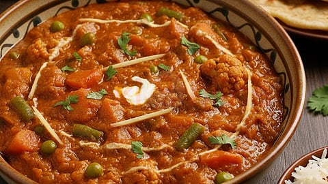 மற்றொரு வாணலியில் எண்ணெய் விட்டு பொடியாக நறுக்கிய வெங்காயம் சேர்த்து வதக்கவும். வெங்காயம் நிறம் மாறியதும், தக்காளி, இஞ்சி பூண்டு விழுது, கரம் மசாலா, தேவையான உப்பு, தனியா தூள், மிளகாய்த்தூள் சேர்த்து நன்கு வதக்கவும். நன்கு வதங்கியதும் தனியாக வதக்கி எடுத்து வைத்துள்ள காய்கறிக் கலவையையும், பன்னீர் துண்டுகளையும் சேர்த்துக் கலந்து 2 கப் தண்ணீர் விட்டு, அடுப்பை மிதமான சூட்டில் வைத்து கொதிக்க விடவும். கடைசியாக கஸ்தூரி மேத்தி, பொடியாக நறுக்கிய கொத்தமல்லி தூவி சூடாக பரிமாறவும்.