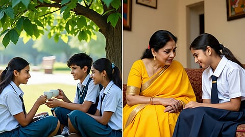 வீட்டை அடைந்ததும் இவர்கள் இருவரும் வாசலிலேயே நிற்க, அவன் உள்ளே சென்று தாயிடம் விஷயத்தை கூறினான். அவள் வெளியே வந்து இருவரையும் உள்ளே அழைத்து சென்றாள். பிறகு மாதவிடாய் ஆன பெண்ணிற்கு வேறு ஆடைகளையும் கொடுத்து sanitary pads ஐயும் கொடுத்து புரிய வைத்து பின் பாத்ரூமிற்கு சென்று குளித்து விட்டு மாற்றி கொண்டு வருமாறு கூறினாள். இரண்டு குழந்தைகளையும் அரவணைத்து கொண்டு பக்குவமாக எல்லாவற்றையும் கூறி புரிய வைத்தாள்.
