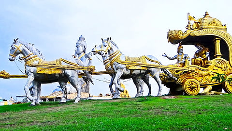 மகாபாராதப் போர் முடிவிற்கு வந்தது. போர்க்களத்தில் போரிட்டு வீரமரணம் அடைந்த இரண்டு தரப்பு வீரர்களின் உடல்கள் அப்பகுதியெங்கும் சிதறிக்கிடந்தன. குருதி நிறைந்த போர்க்கள பூமியில் ஆங்காங்கே மரண ஓலங்கள். அம்புகளால் மாண்டு போன யானைகள் குதிரைகள் என அந்த இடமே மிகவும் பரிதாபகரமாக காட்சி தந்தது. போரில் வெற்றி பெற்றதால் அர்ஜீனன் மிகவும் கர்வமான மனநிலையோடு காணப்பட்டான். தேரின் மீது நின்று நாலா திசைகளிலும் தன் பார்வையைச் செலுத்தி அத்தகைய காட்சிகளை பார்வையிட்டுக் கொண்டிருந்தான்.
