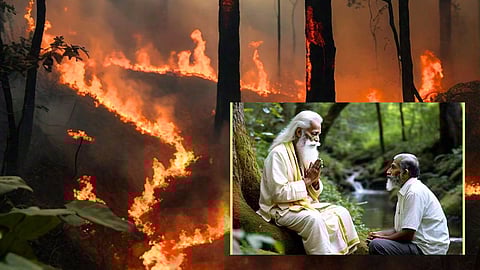 காட்டுக்குள் நடந்து சென்று கொண்டிருந்தார் ஒரு துறவி. சற்று தொலைவில் ஒரு மூங்கில் காடு தீப்பிடித்து கொழுந்துவிட்டு எரிந்து கொண்டிருந்தது. அங்கே ஒரு மனிதன் சோகத்தோடு நின்று அதை வேடிக்கை பார்த்தவாறு இருந்தான்.
