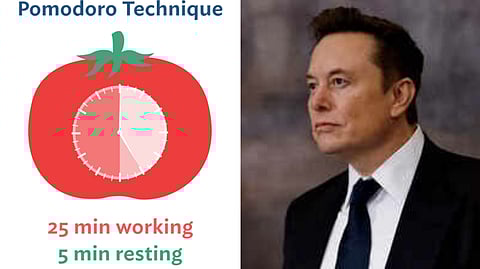 இவர் வாரம் ஒன்றுக்கு 100 மணிநேரம் வேலை செய்வதாகவும் இந்த 100 மணிநேரத்தில் ட்விட்டர், ஸ்பேசெக்ஸ், டெஸ்லா, போரிங் கம்பனி என நாலு கம்பனிகளை நிர்வாகம் செய்வதாகவும் சமீபத்திய செய்திகள் தெரிவித்தன. இந்த பணிகள் நிமித்தம் செயல்படும் நேர மேலாண்மைக்காக "பொமோடோரோ உத்தி" (Pomodoro Technique) எனும் உத்தியை பயன்படுத்துவதாக குறிப்பிடுகிறார் மஸ்க். அதென்ன உத்தி? நாமும் பார்ப்போம்.
