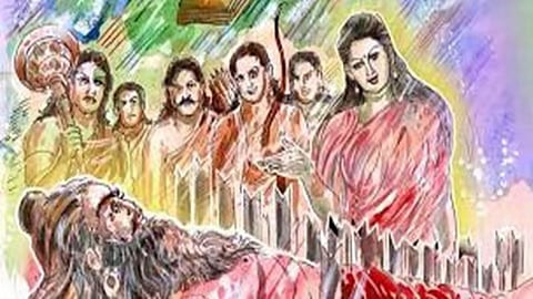 திரௌபதிக்கோ நாணமாகப் போய்விட்டது. "என்னை மன்னித்து விடுங்கள் பிதாமகரே. ஏதோ அறியாமல் சிரித்து விட்டேன்" என்றாள். ஆனால், பீஷ்மர் இந்த பதிலால் திருப்தி அடையவில்லை. அவர், "குழந்தாய் எந்தப் பெண்மணியும் பெரியவர்கள் கூடிய இடத்தில் இப்படி சப்தமாக சிரிக்க மாட்டார்கள். மேலும் நீ சிறந்த குணவதி. அப்படிப்பட்ட உனக்கு காரணம் இன்றி எதற்காக சிரிப்பு வந்திருக்கும்? எனவே, வெட்கப்படாமல் சிரித்ததற்கான காரணத்தைச் சொல்" என்று கனிவுடன் கேட்டார்.