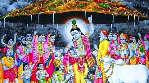ஆழி மழையில் இருந்து மக்களைக் காக்கும் பொருட்டு கோவர்த்தன மலையையே தூக்கிய பகவான் ஸ்ரீ கிருஷ்ணர் அதைத் தனது சுண்டு விரலால் தாங்கிப் பிடிக்க, அது ஒரு குடை போல் மாறிப்போனது. பிருந்தாவனத்தில் மழை வேண்டி இந்திரனுக்கு யாகம் செய்ய கோகுலத்து மக்கள் ஏற்பாடு செய்திருந்தனர். தனது பதவியையும் பலத்தையும் எண்ணி இறுமாப்புக் கொண்டிருந்த இந்திரனுக்கு பாடம் புகட்டவே கிருஷ்ணர் அவ்வாறு செய்தார். கோகுலத்து மக்களும் கிருஷ்ணர் சொன்னபடியே செய்தனர்.
