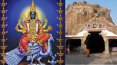 இத்தல முருகப்பெருமானுக்கு ஒரு முகமும் ஆறு கரங்களும் உள்ளன. தென்னிந்தியாவிலேயே இம்மாதிரியான திருக்கோலம் கொண்ட முருகன் கோயில் இது மட்டுமே. தாரகாசுரனை வதம் செய்த கார்த்திகேயனை அதே கோலத்துடன் காட்சி அளிக்கிறார் என்று கூறப்படுகிறது. முருகன் மேற்கு முகமாக அருளும் சன்னிதானத்தை உடைய மலை. தனது இடது காலை மயிலின் கழுத்திலும் வலது காலை தொங்கவிட்டும் கையில் கதிர்வேலுடன் காட்சி தருகிறார்.