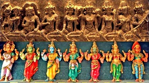 சப்த கன்னிமார்கள்: கன்னிமார்கள் இரண்டு கரங்களுடன் இருப்பவர்கள். ஒரு கையில் மலர் ஏந்தி, மறு கையைத் தொங்க விட்டுக் கொண்டிருப்பவர்கள். இவர்கள் பொதுவாக கிழக்கு நோக்கியும் அபூர்வமாக தெற்கு நோக்கியும் கோயில் கொண்டிருப்பர். கன்னிமார்கள் எப்போதும் தனியாக ஒரே வரிசையில் இருப்பார்கள்.