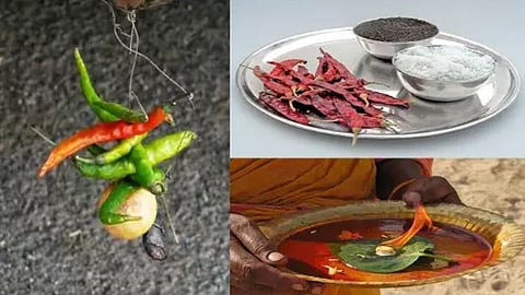 கண் திருஷ்டி படாமல் இருக்கவும், மற்றவர்களின் ஏக்கப் பார்வை, துஷ்டப் பார்வை, பொறாமை என எதுவாக இருந்தாலும் அதனை ஈர்க்கும் சக்தி எலுமிச்சை மற்றும் பச்சை மிளகாய்க்கு உண்டு. அத்துடன் எலுமிச்சை மற்றும் மிளகாயின் வாசனை காரணமாக கொசுக்கள் மற்றும் ஈக்கள் வீட்டில் வராமல் தடுக்கப்படுவதால் நோய் தொற்றிலிருந்தும் நம்மைப் பாதுகாத்துக் கொள்ளலாம். வாஸ்து சாஸ்திரத்தின்படி எலுமிச்சை மரம் இருக்கும் வீட்டில் மகிழ்ச்சியும், செழிப்பும் இருக்கும். இவை தீய சக்திகளை உறிஞ்சி நல்ல சக்தியை பரப்பும் என்று கூறப்படுகிறது.