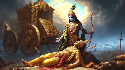 அவன் செய்த தர்மங்களுக்கு அளவேயில்லை. அதனால் குற்றுயிராக கர்ணன் போர்க்களத்தில் கிடந்தபோது, அவன் செய்த தர்மங்கள் அவன் உடலிலிருந்து உயிரைப் போக விடாமல் காத்து நின்றன. இதனைக் கண்ட கண்ணன், ‘நீ செய்த தர்மத்தின் பலன் யாவையும் தந்துதவுக’ என்று வேண்டுகிறான். மார்பில் புதைந்த அம்பை எடுத்துக் கொட்டும் செங்குருதியில் அவன் செய்த தர்மத்தின் பலன் யாவையும் கண்ணனுக்கு அர்ப்பணிக்கிறான் கர்ணன்.