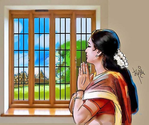 அவள் சொன்னாற்போல் மாடிப்பகுதியில் இருந்த இரண்டு ஜன்னல்கள் வழியே மாமாங்கா குளம் அழகாகத் தெரிந்தது. மீனாக்ஷியம்மா குளத்தையும், கைலாசநாதர் கோபுரத்தையும் பார்த்து கன்னத்தில் போட்டுக் கொண்டாள்.