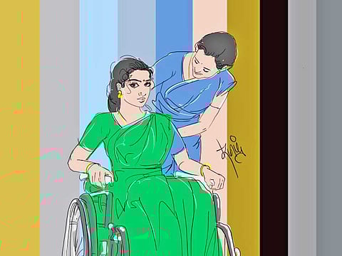 வீல்சேர் ஒன்றில் ஒரு பெண்மணி.