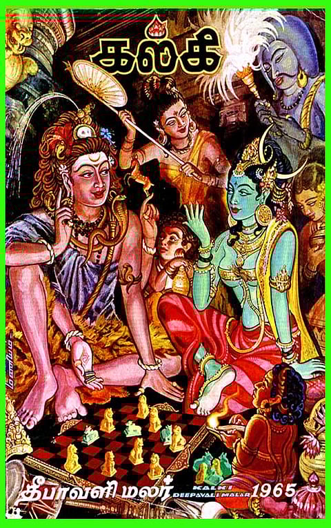 பரமசிவனும் பார்வதியும் சதுரங்கம் ஆடும் இந்த அழகான காட்சி, வண்ணப்படமாக! வரைந்த அமரர் கல்கி அவர்களின் 'பொன்னியின் செல்வன்' கதாபாத்திரங்களுக்கு உயிரோட்ட வடிவம் தந்த ஓவியர் மணியம். மணியம் வரைந்த இந்தச் சித்திரத்துக்கு அப்போது சிறுவனாக இருந்த மணியம் செல்வனும், அவருடைய சித்தியும் மாடல்களாக அமர்ந்து அபிநயித்த சுவாரஸ்யமான அனுபவத்தை அமுதசுரபி இதழில் தனது தந்தையாரைப் பற்றிய தொடர் கட்டுரையில் குறிப்பிட்டிருக்கிறார்.