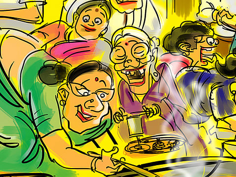 பெண்கள் அனைவரும் கூடி, அரட்டை அடித்தபடியே மாவு பிசைந்து, தட்டை தட்டி, முறுக்கு சுற்றி பலகாரம் செய்யும்போது களைப்போ அலுப்போ தெரியாமல் வளைய வருவர். வீட்டுச் சிறுசுகள் முதல் ஈடு முறுக்கையோ, தட்டையையோ சுவை பார்த்துத் தர காத்துக்கிடப்பர்.