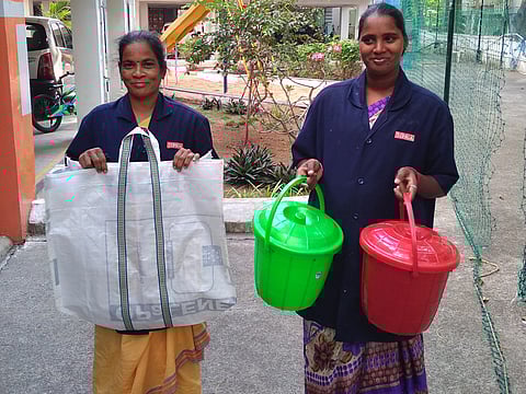 இவர்கள் பச்சை நிறத் தொட்டி, சிவப்பு நிறத் தொட்டி, ஒரு பெரிய பை என குடியிருப்பின் அனைத்து வீட்டார்களுக்கும் கொடுத்துள்ளனர்.