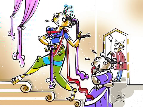 "நம் மன்னர் போரிலிருந்து வருகிறாராம். நெற்றிக்கு திலகம் தயார் செய்யவா?"