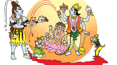 பிட்சா பாத்திரம் நிரம்பியதே தவிர, கபாலம் கீழே விழவில்லை. ருத்ரன் அந்தக் குருதியைத் துழாவினார். கடையப்பட்ட அந்த ரத்தத்திலிருந்து தேஜஸுடன் ஒரு வீர புருஷன் தோன்றினான்.