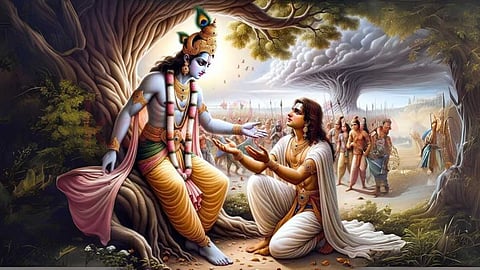 கிருஷ்ணா கூறுகிறார், "உத்தவா, நான் சாட்சியாக இருக்கிறேன் என்பதை உணர்ந்தால் நீ எப்படி தவறு செய்வாய்? எனக்கு தெரியாமல் சூது விளையாட நினைத்தது தர்மனின் அறியாமை. போரினால் பேரழிவு ஏற்படும் என்பதால், அதை தடுக்கவே நான் சமாதான தூது சென்றேன். துரியன் அதை ஏற்கவில்லை, பாண்டவர்களும் போரில் பிடிவாதமாக இருந்தனர். இதில் என் பங்கு என்ன? என்னை நம்பிய அர்ஜூணனை காக்க தேரோட்டியாக இருந்தேன். போரில் நான் ஈடுபடவில்லை. நீங்கள் நல்லது செய்யும் போதும், தவறு செய்யும் போதும் கடவுள் எப்பொழுதும் நம்முடன் இருக்கிறார் என்பதை உணருங்கள், நம்புங்கள்." என்றார் கிருஷ்ணர்.