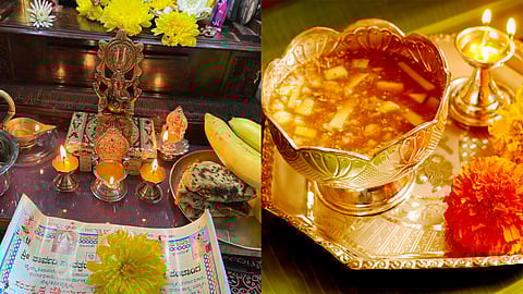 அன்றைய தினம் முதல் நாள் இரவே பூஜையறையை சுத்தம் செய்து, விடியற்காலையில் எழுந்து பூஜை அறையில், சுவாமி படத்திற்கு முன் வைக்கப்பட்டிருக்கும் மங்களகரமான வஸ்துக்களை பார்த்த பின்பு தான் மற்ற வேலைகளை தொடங்குவார்கள். எண்ணெய் ஸ்நானம் செய்துவிட்டு, புது வஸ்திரம் உடுத்தி, பிள்ளையார், பிரம்மா, விஷ்ணு, சிவன் மட்டுமல்லாமல் அவர்களின் பத்தினிகளையும் ஆராதனை செய்து, வீட்டில் பெரியவர்களை வணங்கிக் கொள்வார்கள். ஒருவருக்கொருவர் பரிசுப் பொருட்களை பரிமாற்றம் செய்து கொள்ளவும் செய்வார்கள்.