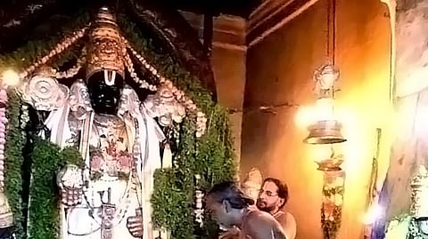 செய்வதறியாது மார்கண்டேயன் தனது கண்களை மூடி திருமாலை வேண்டி கண்களைத் திறந்தார். அப்போது திருமாலே அவர் முன் தோன்றி, அவரிடம் வளர்ந்தது பூமாதேவியே என உரைத்து அவளை மணம் முடித்ததாக ஸ்தல புராணம் கூறுகிறது. இதனால், மார்க்கண்டேயரின் விருப்பமும் நிறைவேறியது. அதனால் இன்றும் இங்கு சுவாமிக்கு உப்பில்லாமல் தான் தினமும் உணவு நைவேத்தியம் செய்யப்படுகிறது.
