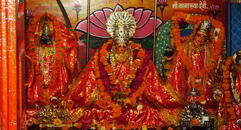 கருவறையில் அருளும் மாயா தேவி தனது சிரசில் கிரீடம் சூட்டியுள்ளாள். பின்புறச் சுவரில் வெள்ளிச்சக்கரம் அமைந்துள்ளது. அன்னை தமது திருமேனி முழுவதும் பூமாலைகள், நகைகள் என ஜொலிக்கிறாள். மாயா தேவிக்கு அருகில் இருபுறமும் சூலமும், மேலே குடையும் பொருத்தப்பட்டுள்ளது. அருகில் காளியும் காமாக்யாவும் மிக அழகாகக் காட்சி தருகின்றனர். வடநாட்டில் சக்தியை ஒற்றையாக வைத்து வழிபடுவதில்லை. பொதுவாக காளி, சரஸ்வதி ஆகியோர்தான் உடன் இருப்பர். ஆனால், இங்கு காமாக்யா அருள்பாலிக்கிறாள். கோயில் வாசலில் பைரவருக்கு சிறிய சன்னிதி உள்ளது.