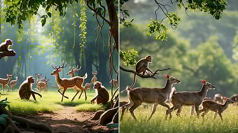 குட்டி மானுக்கு இந்த நந்தவனத்தில் பிடிக்காத விஷயம் இருந்தது. அது அங்கு மரத்தில் இருந்த குரங்கு குட்டிகள். அவைகள் பார்ப்பதற்கு மயில்களை போன்று அழகாக இருக்காது. அருவருப்பாக இருக்கும். அதனால் குரங்குகளை விளையாட்டில் சேர்த்துக் கொள்ளாது. அவைகள் மரத்தின் கிளைகளில் பரிதாபமாக அமர்ந்தபடி இவர்கள் விளையாடுவதை வேடிக்கை பார்க்கும்.