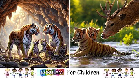 Hundreds of years ago, in one of the jungles of what we call Kerala today, a tiger family lived in a cave on the face of a mountain slope. The father tiger was called Angry, the mother was called Ruby, and their two children were called Stripy and Tabby.