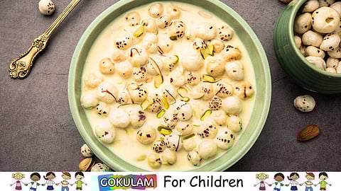 Finally, we added chopped almonds and cashews to make it extra special. Mom said we could eat it warm or cold, but we were too excited to wait! So, we tried it warm and…WOW! It was sweet, creamy, and the fox nuts were like soft clouds in our mouths.